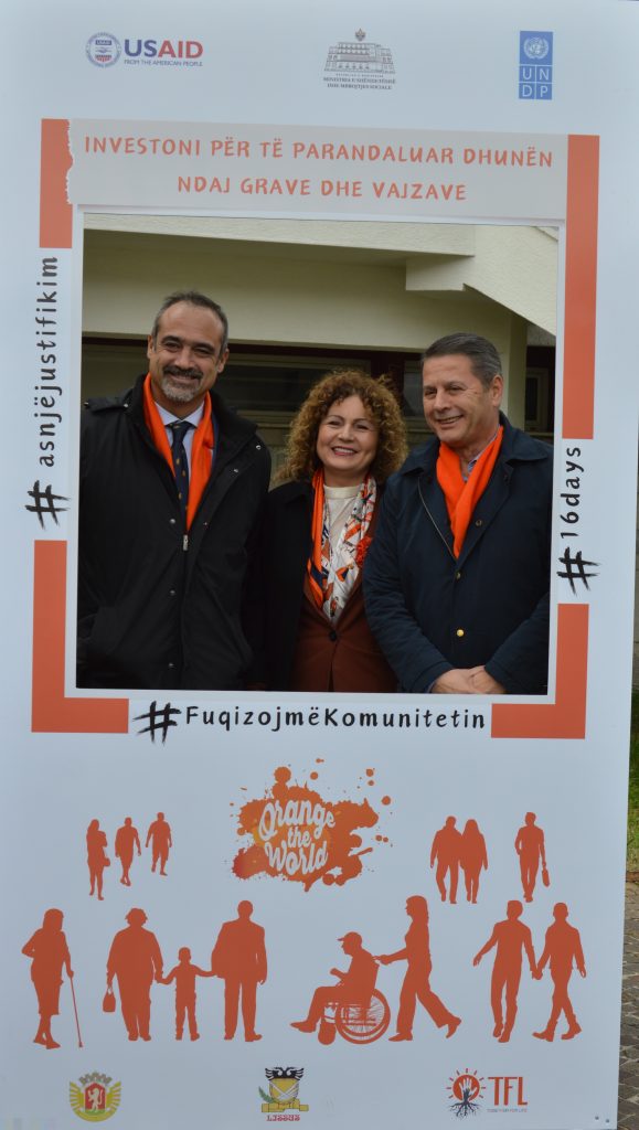 Po ashtu, pjesëmarrësit u ftuan të realizonin fotografi në kornizën e vendosur në hapësirën e jashtme të Biblotekës në Lezhë nën sloganin global “Investoni për të parandaluar dhunën ndaj grave dhe vajzave”.