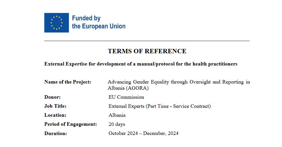 In the frame of the project “Advancing Gender Equality through Oversight and Reporting in Albania (AGORA)“, led by the Gender Alliance for Development Centre (GADC) in partnership with Together for Life (TFL) and the Institute of Romani Culture in Albania (IRCA), “Together for Life” will contract a professional expert that will work on the preparation of a manual that will inform the health practitioners about GBV and their legal obligations in the framework of this project.