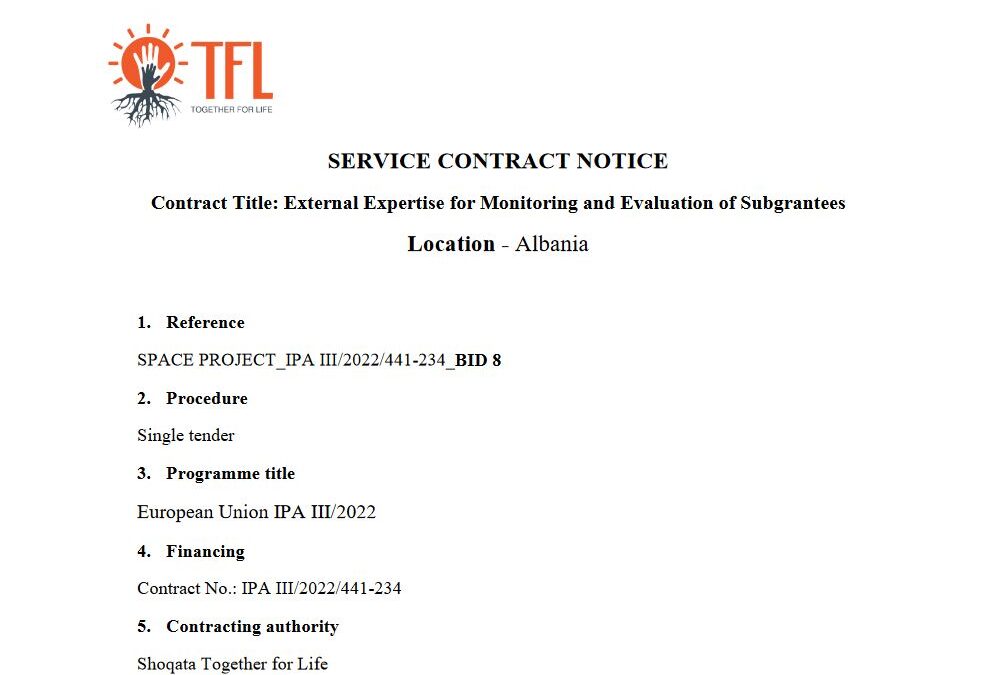 In the framework of the project “Support Participation, Accountability and Civil Society Empowerment (SPACE)”, funded by European Union, Together for Life is seeking to contract a monitoring and evaluation expert for the six organizations that have been awarded grants during the first phase of the sub-granting scheme.