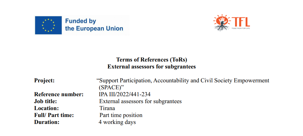 “Together for life” association, in cooperation with BIRN Albania, Qëndresa Qytetare and Destiny Center for Excellence, is implementing the project “Support Participation, Accountability and Civil Society Empowerment” (SPACE). This project is funded by the European Commission, reference EuropeAid/174080/DD/ACT/.