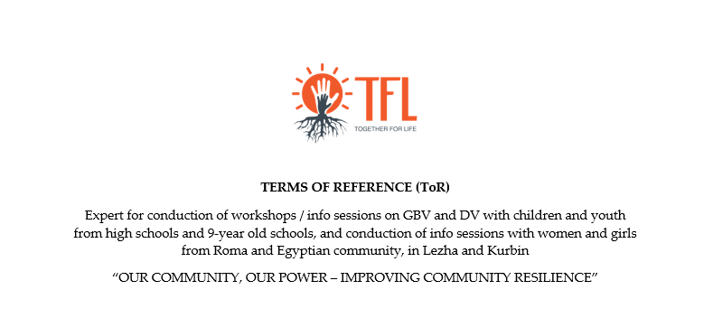TFL is seeking for an experienced Expert to conduct workshops / info sessions on GBV and DV with children and youth from high schools and 9-year-old schools in Lezha and Kurbin, and conduction of info sessions with women and girls from Roma and Egyptian community in Lezha and Kurbin (both urban and remote areas). The workshops / info sessions will be based on a toolkit elaborated within the project, that provide practical guidance, resources, and strategies to prevent, identify, and respond to GBV and DV.