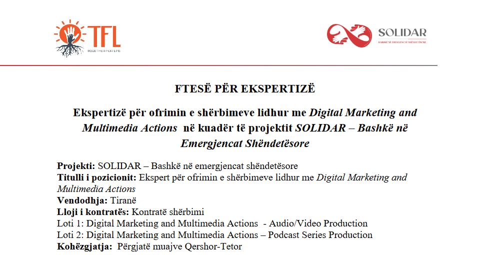 FTESË PËR EKSPERTIZË – Ekspert për ofrimin e shërbimeve lidhur me marketingun dixhital dhe multimedia (video/audio) në kuadër të projektit SOLIDAR – Bashkë në Emergjencat Shëndetësore
