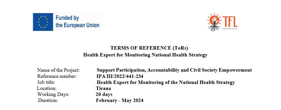 In the framework of “Support Participation, Accountability and Civil Society Empowerment (SPACE)” project, funded by European Union, Together for Life is seeking to contract a health expert for monitoring the health policies aspects of the National Health Strategy 2021-2030.