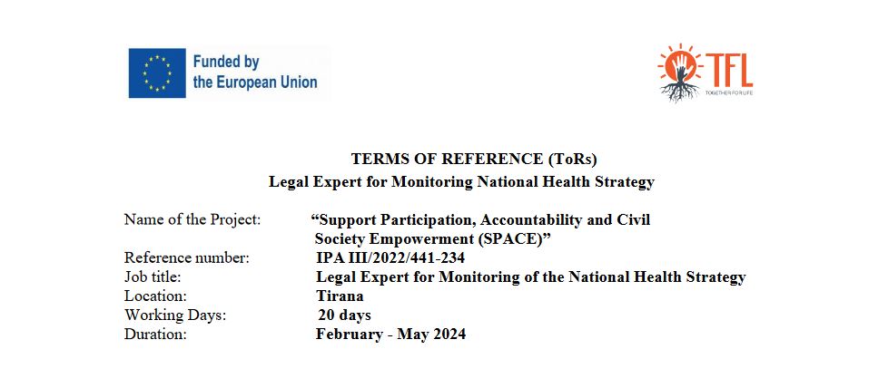 In the framework of “Support Participation, Accountability and Civil Society Empowerment (SPACE)” project, funded by European Union, Together for Life is seeking to contract a legal expert for monitoring the health policies aspects of the National Health Strategy 2021-2030.