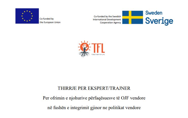 Thirrje për ekspert/trajner për ofrimin e njohurive përfaqësuesve të OJF vendore në fushën e integrimit gjinor në politikat vendoren ë kuadër të projektit: “Integrimi gjinor në politikat socio-ekonomike të bashkive në qarkun e Lezhës”