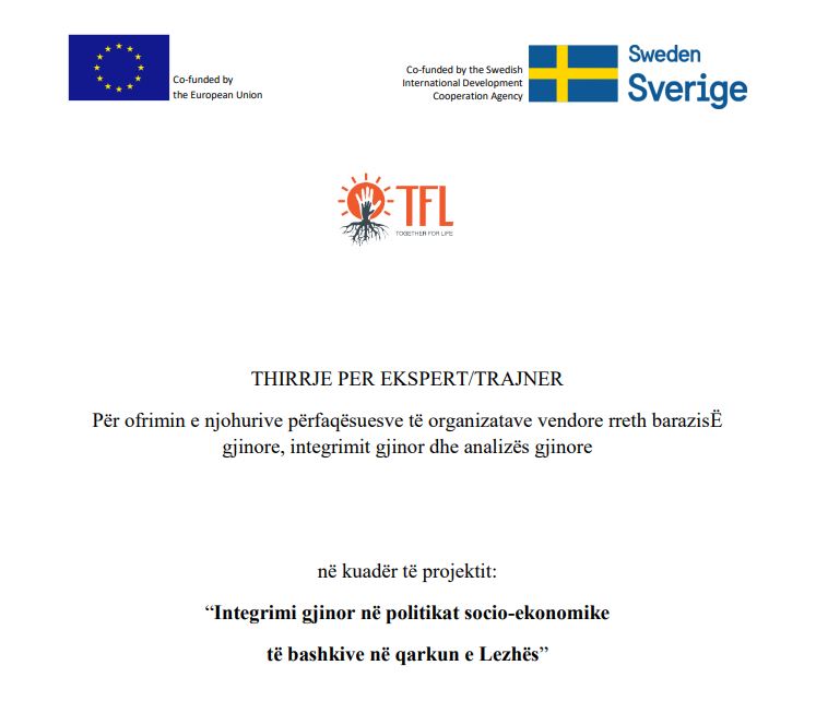 Thirrje për ekspert/trajner për ofrimin e njohurive përfaqësuesve të OJF vendore rreth barazisë gjinore, intergrimit gjinor dhe analizës gjinore në kuadër të projektit: “Integrimi gjinor në politikat socio-ekonomike të bashkive në qarkun e Lezhës”