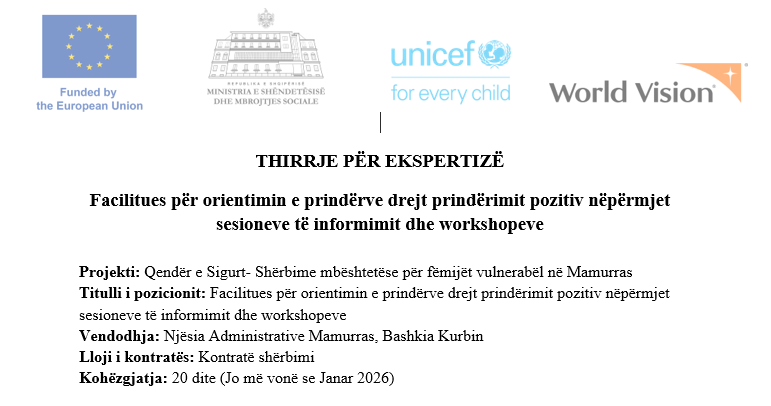 Together for Life (TFL) po kërkon të kontraktojë një ekspert që do të shërbejë si Facilitues për orientimin e prindërve drejt prindërimit pozitiv për të realizuar sesione informuese dhe fuqizuese me prindërit që ato të jenë mbështetje për zhvillimin psiko-emocional të shëndetshëm të fëmijëve të tyre. Këto sesione / workshope do të zhvillohen pranë Qendrës “Zëri i Fëmijëve”, Mamurras.