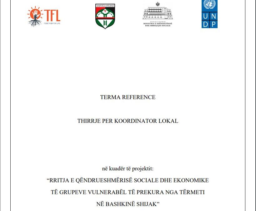 Thirrje per koordinator lokal në kuadër të projektit: “Rritja e qëndrueshmërisë sociale dhe ekonomike të grupeve vulnerabël të prekura nga tërmeti në bashkinë Shijak”.