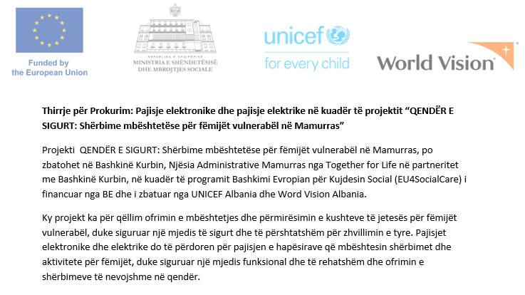 Thirrje për Prokurim: Pajisje elektronike dhe pajisje elektrike në kuadër të projektit “QENDËR E SIGURT: Shërbime mbështetëse për fëmijët vulnerabël në Mamurras”