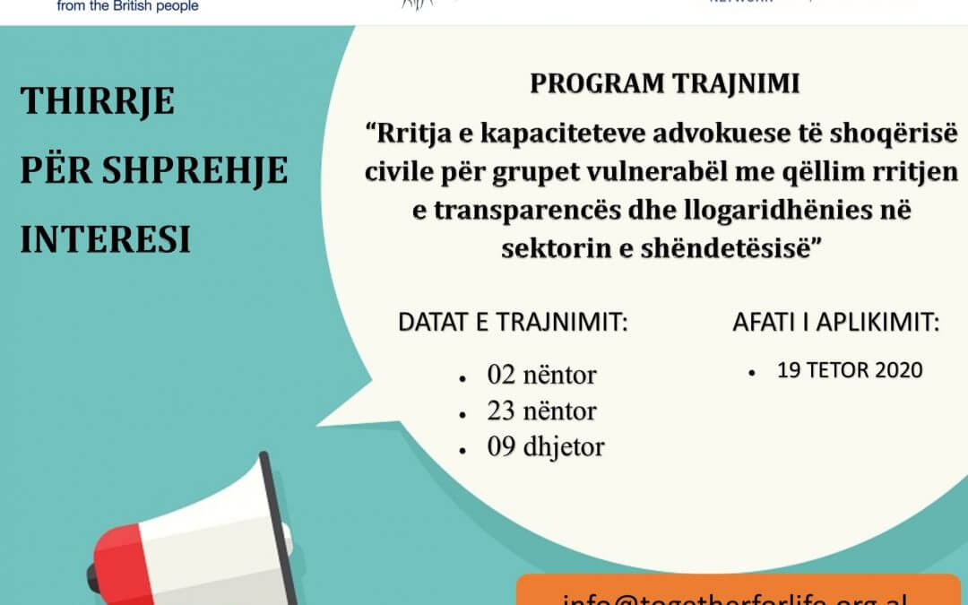 Thirrje e hapur për të marrë pjesë në trajnimin e shoqatave të shoqërisë civile që mbulojnë grupet vulnerabël me qëllim rritjen e kapaciteteve në advokimin për transparencë dhe llogaridhënie në sistemin shëndetësor